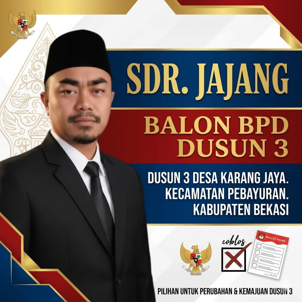 Pebayuran- Sosok Sdr. Jajang resmi maju sebagai calon anggota Badan Permusyawaratan Desa (BPD) untuk Dusun 3, Desa Karang Jaya, Kecamatan Pebayuran, Kabupaten Bekasi. Dengan semangat perubahan dan kemajuan desa, ia membawa visi untuk meningkatkan kesejahteraan masyarakat melalui program yang lebih aspiratif dan transparan.